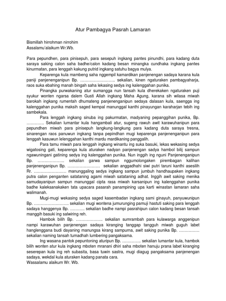 Atur Pambagya Pasrah Lamaran from imgv2-2-f.scribdassets.com Check spelling or type a new query. We did not find results for: Teks pasrah temanten bahasa jawa singkat. Maybe you would like to learn more about one of these?